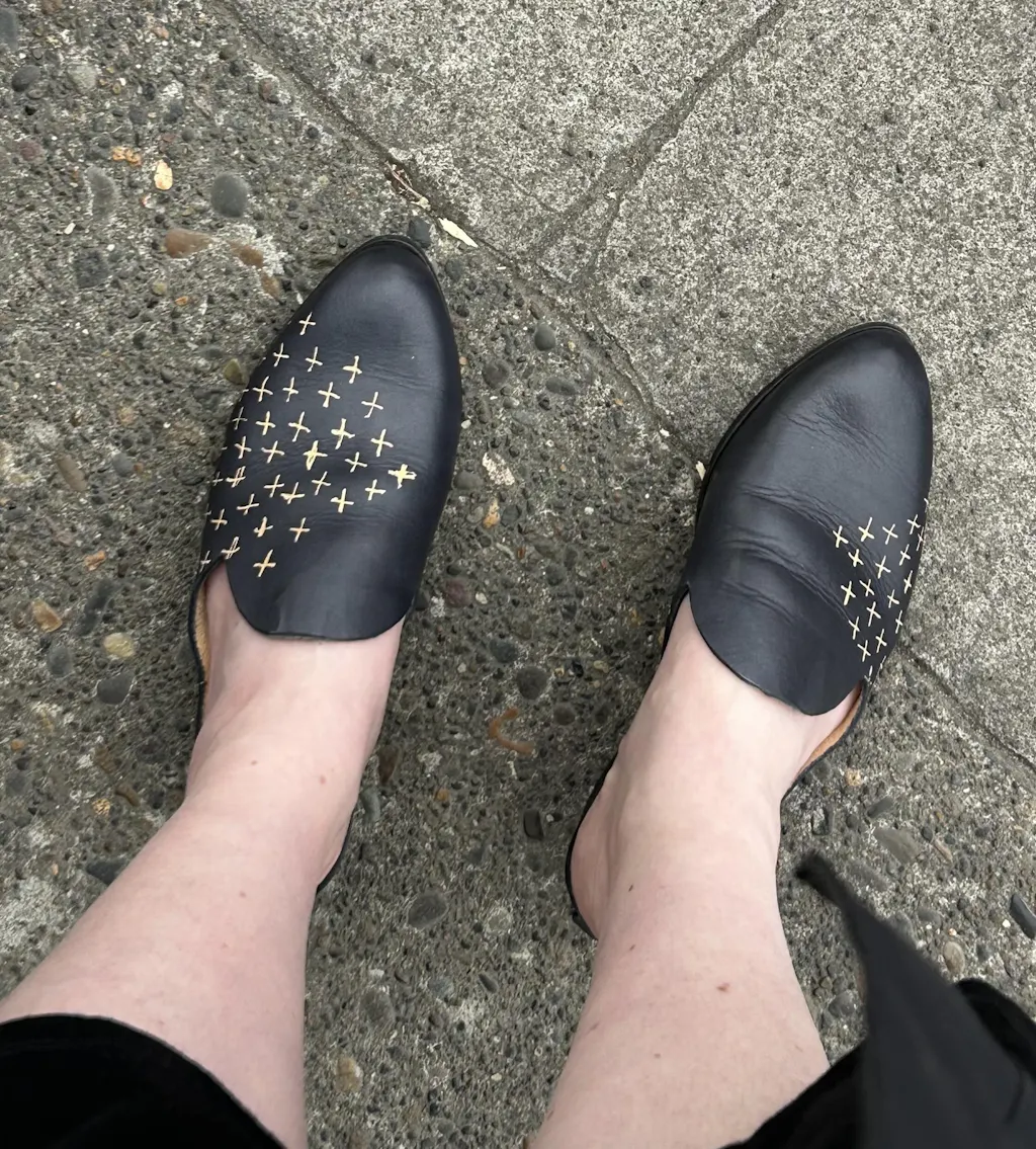 These shoes are hand cut and hand dyed, so variations are usual and we believe add to the uniqueness of a handmade shoe.